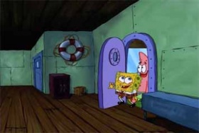 En la cocina hay unas puertas que se encuentran a lado de las cosas que se encuentran en ella, una puerta que nos conduce con el Baño ,que en otros episodios es un gabinete de limpieza. Una conduce a a la Oficina de Don Cangrejo (Llamado de la Naturaleza) aunque en otros episodios es la Bodega. Otra puerta es para entrar y salir.
